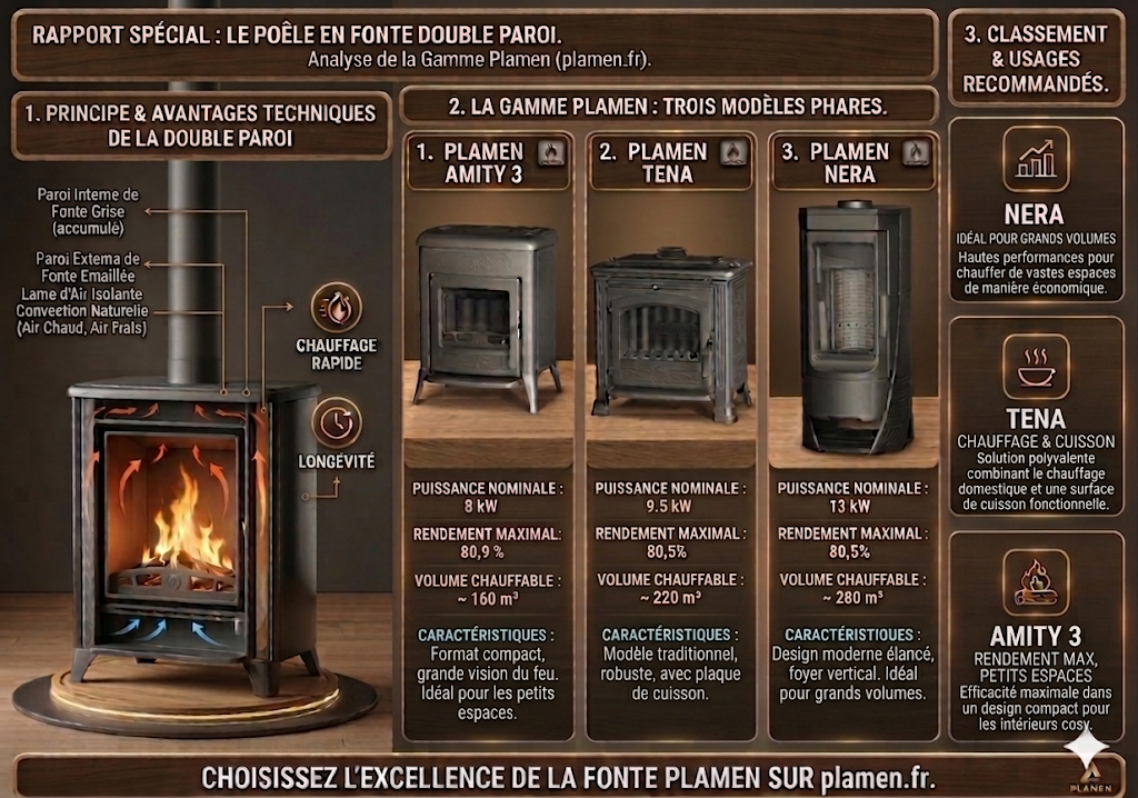 Voici une synthèse complète regroupant les principes techniques du poêle en fonte double paroi et l'analyse spécifique des modèles de la marque Plamen (Nera, Tena et Amity 3).